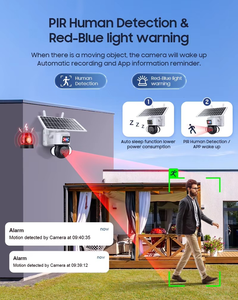 • Detecție PIR Inteligentă & Urmărire Automată: Senzorul PIR avansat detectează mișcarea bazată pe căldura corporală umană, reducând semnificativ alarmele false. Camera poate urmări automat persoanele detectate și să vă trimită notificări instantaneu pe telefon.