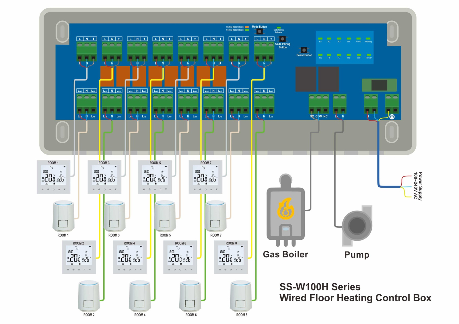 SS-W100H este un centru de control pentru sisteme de încălzire în pardoseală cu apă, proiectată pentru a asigura un control precis al temperaturii în mai multe încăperi, prin conectarea termostatelor cablate și a actuatoarelor. Este soluția ideală pentru locuințe, birouri sau spații comerciale care utilizează sisteme hidraulice de încălzire.